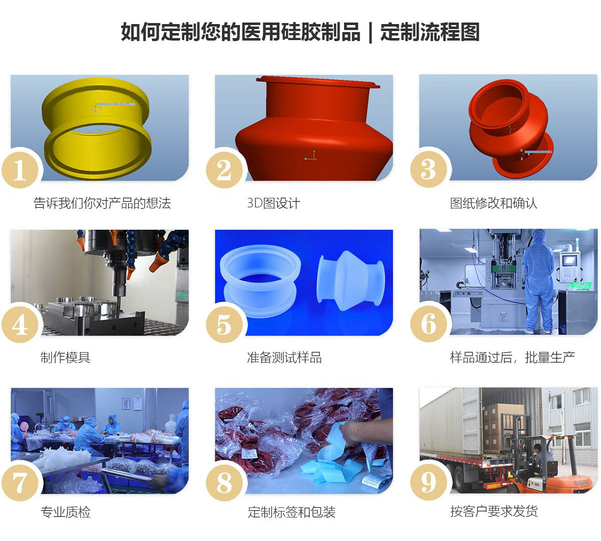 我廠擁有強大的工程設計團隊; 硅膠制品煉膠車間; 硅膠制品模壓車間; 液態硅膠注塑車間、質檢部、包裝部,可為您的產品報價護航。嘉杰公司已成功完成超10000個硅膠制品定制開模案例。下圖是我們的醫用硅膠制品定制流程圖: