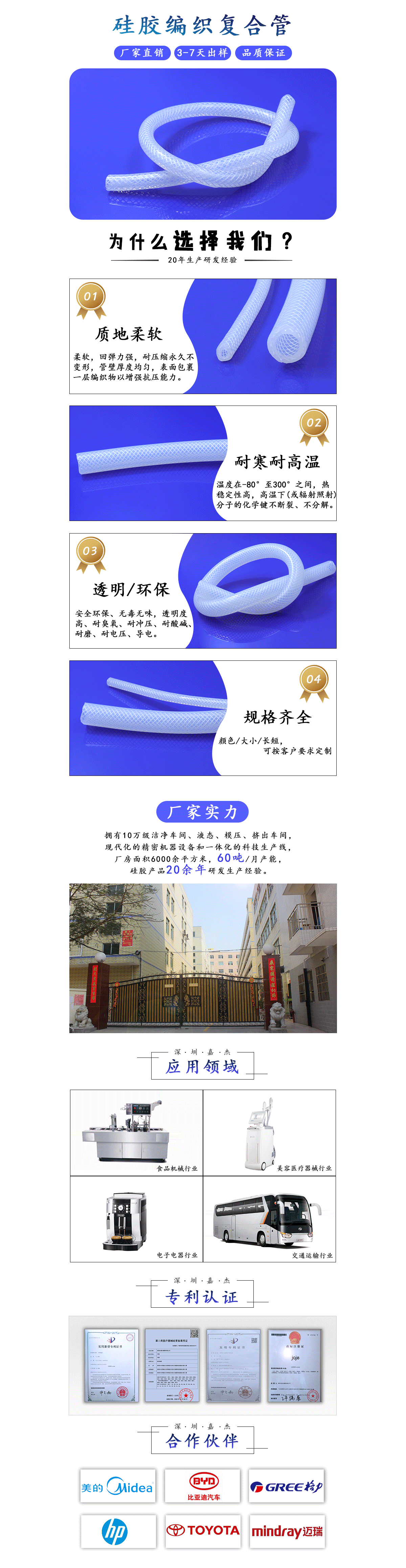 硅膠編織管復(fù)合管是一種纖維編織硅膠管,經(jīng)硫化制成,管壁厚度均勻,表面包裹一層編織物以增強抗壓能力。、
